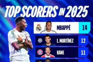体育资讯12月31日讯 皇马前锋姆巴佩在2025年打进59球,追平C罗记录,创个人年度新高。欧冠官方社媒晒出2025年欧冠射手榜,其中姆巴佩以14球排名榜首。