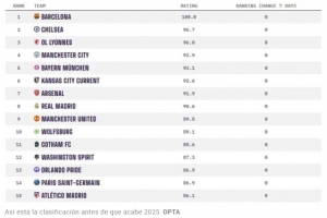 相比之下,男足的排名则有所不同。阿森纳以满分100分位居榜首,拜仁慕尼黑(98.2分)和曼彻斯特城(98.1分)分列第二和第三位。巴黎圣日耳曼(96.5分)和巴塞罗那(95.6分)也名列前茅。皇家马德里男足目前排名第10,评分为93.4分,在最近一次更新中下降了两个位置。切尔西(第8位,93.7分)和国际米兰(第9位,93.6分)都超过了他们。