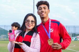 体育资讯12月31日讯 恒大足球学校全胜夺得U17精英联赛冠军,赛后张洪福的妈妈与儿子合影庆祝。