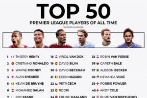 体育资讯12月31日讯 近日,知名体育媒体《体育画报》公布了英超历史50大球星,其中亨利第一,C罗第2,萨拉赫第6。