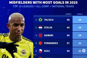 体育资讯1月4日讯 《转会市场》统计了2025年前十联赛中场的俱乐部+国家队各项赛事进球最多情况,塔利斯卡居首。