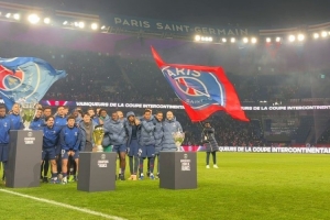 巴黎圣日耳曼德比战展示球队2025年获得的奖杯,俱乐部官方社媒晒出视频。