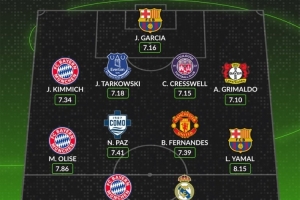 WhoScored五大联赛2025年最佳阵容(联赛场均评分)