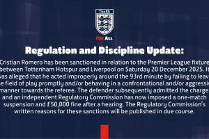 克里斯蒂安・罗梅罗因2025年12月20日(周六)托特纳姆热刺对阵利物浦的英超赛事,遭到纪律处罚。