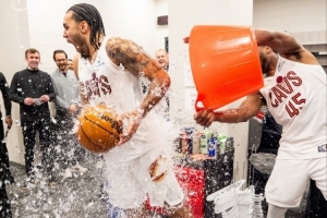 赛后,骑士官推晒图,泰森得到了本场的比赛用球,当家球星米切尔则泼水庆祝泰森的出色表现。