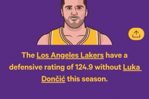 湖人在本场过后,东契奇在场时,防守效率116.2;东契奇不在场时,防守效率124.9。