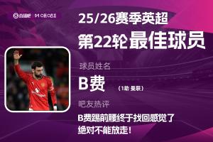 2025-2026赛季英超火热进行中,体育资讯和咪咕体育联合发起每轮英超最佳球员评选活动!第22轮评选结果已经出炉,曼联队长B费送出助攻帮助球队击退曼城,赢下曼市德比,成功当选本轮英超最佳。