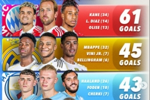 体育资讯1月24日讯 数据网站Score90盘点了本赛季五大联赛球队进攻三叉戟在各项赛事进球榜,具体如下: