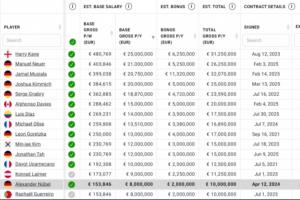 目前拜仁球员的薪资水平在全球位列第一梯队,据球员薪资数据网站capology的信息,目前已经有6名拜仁的球员的年薪+奖金超过了2000万欧,其中凯恩与穆西亚拉超过3000万欧。于帕续约后,拜仁队内将有7人年薪+奖金超过2000万欧。