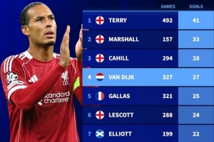 体育资讯2月12日讯 德国转会市场统计了英超历史上中后卫进球数据排名,约翰·特里41球居首,范戴克27球第四。