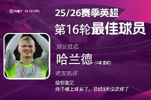 2025-2026赛季英超火热进行中,体育资讯和咪咕体育联合发起每轮英超最佳球员评选活动!第16轮评选结果已经出炉,曼城前锋哈兰德当选!