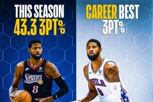 本赛季,乔治三分命中率43.3%,场均出手6次三分,可以命中2.6记。乔治生涯三分命中率38.4%。