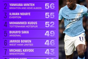 3、恩迪亚耶(埃弗顿):55次